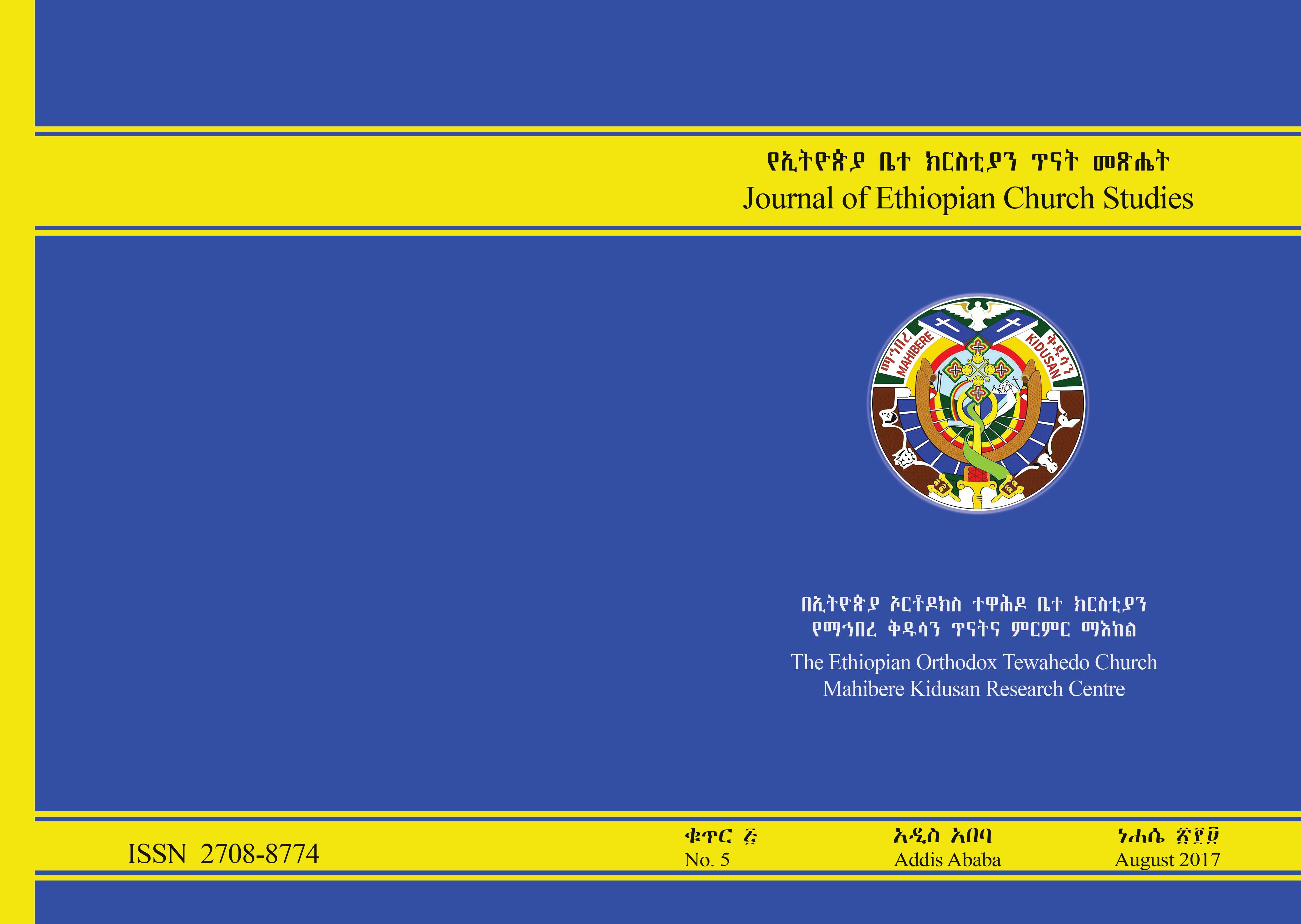 Vol. 5 No. 5 (2017)The Journal of Ethiopian Church Studies(JECS) is a high-quality peer-reviewed research journal that is published under the Ethiopian Orthodox Tewahido Church Research Institute(EOTCRI) once in a year. JECS is providing a platform for researchers, academicians, professionals, practitioners, and students to impart and share knowledge in the form of research articles. JECS welcomes and acknowledges high quality theoretical and empirical original research papers, case studies, review papers, literature reviews book reviewers, and professional and technical notes from researchers, academicians professionals, practitioners, and students from all over the world. The journal consists of scientific articles in line with research priority areas of the Ethiopian